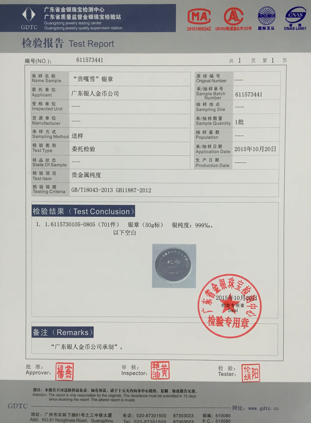 每一款產品均由廣東省質監單位進行全面檢測、出具含金量、含銀量、黃金白銀品質、純金純銀重量、金銀紀念幣品相等方面的權威鑒定證書和檢測報告,確保廣東銀人金幣公司的每枚紀念金銀幣的質量。