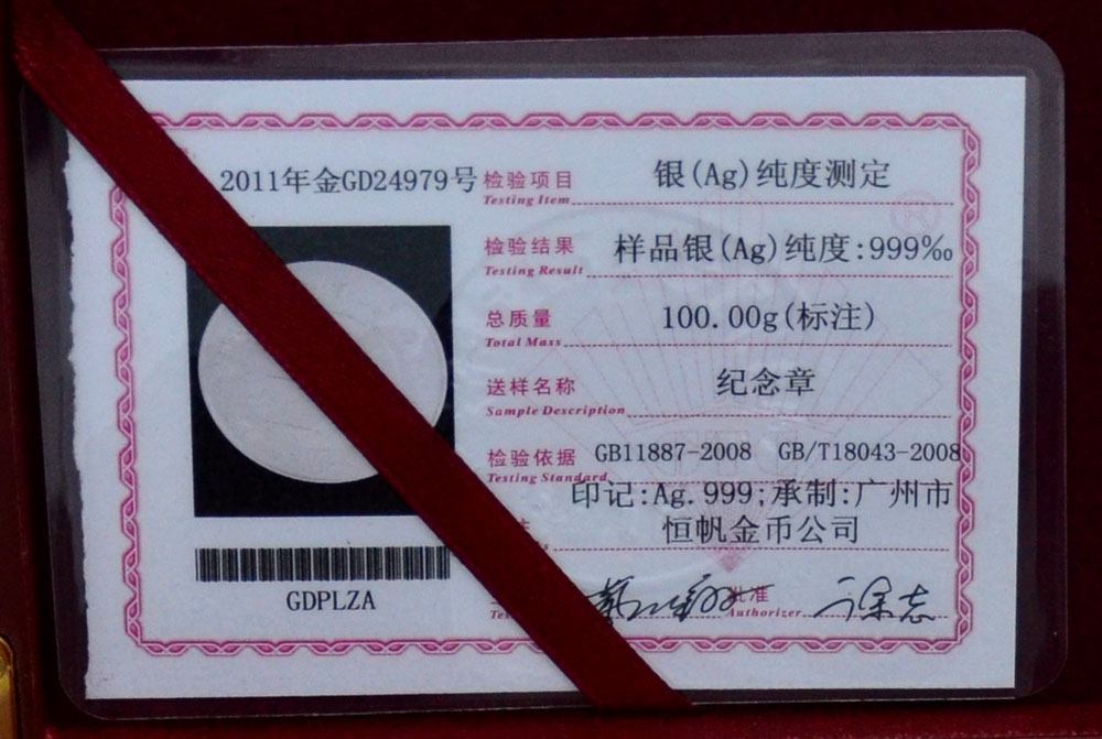 廣東省質監純金銀紀念章鑒定報告