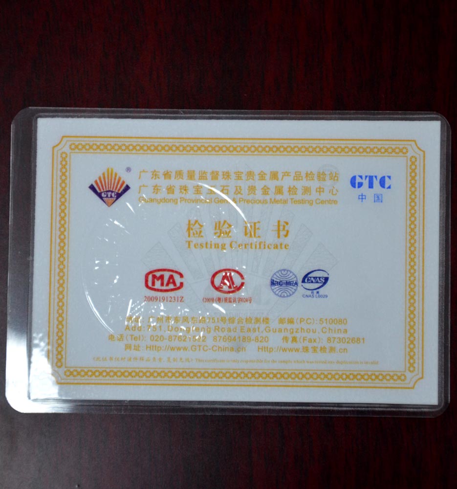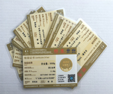 廣東省質監局黃金千足金純金鑒定證書