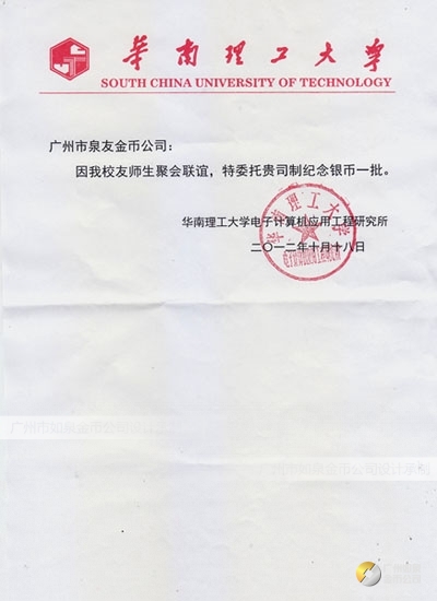2012年10月:華南理工大學(xué)同學(xué)師生聚會(huì)制作紀(jì)念金幣定制