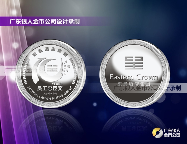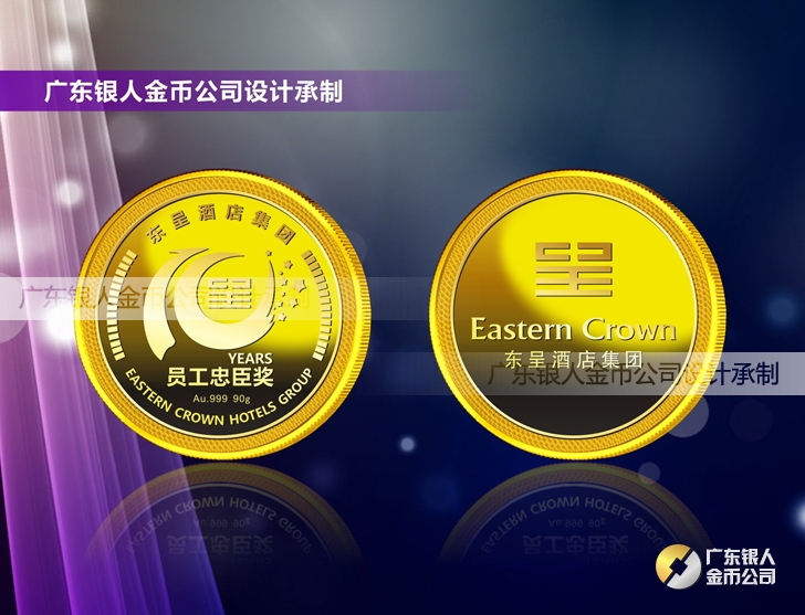 東呈酒店集團(tuán)年會(huì)獎(jiǎng)勵(lì)十年老員工純銀紀(jì)念章制作、千足金紀(jì)念金幣定制