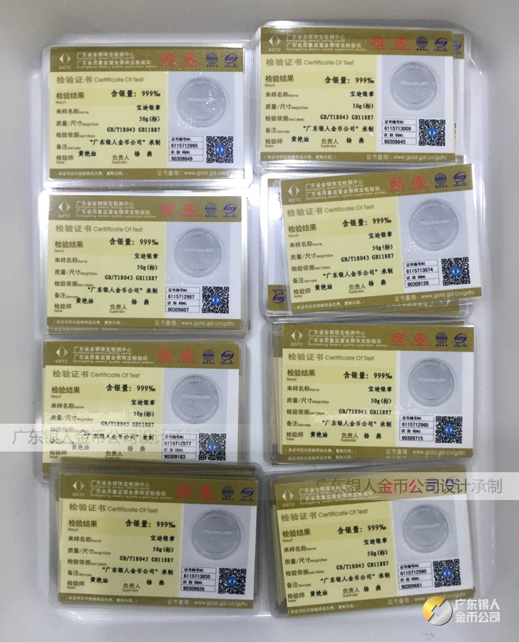 廣東銀人金幣公司承接客戶個性化定制的金銀幣、金銀章、金銀條、金銀牌、金銀盤均由國家質監部門、嚴格檢測、權威鑒定: