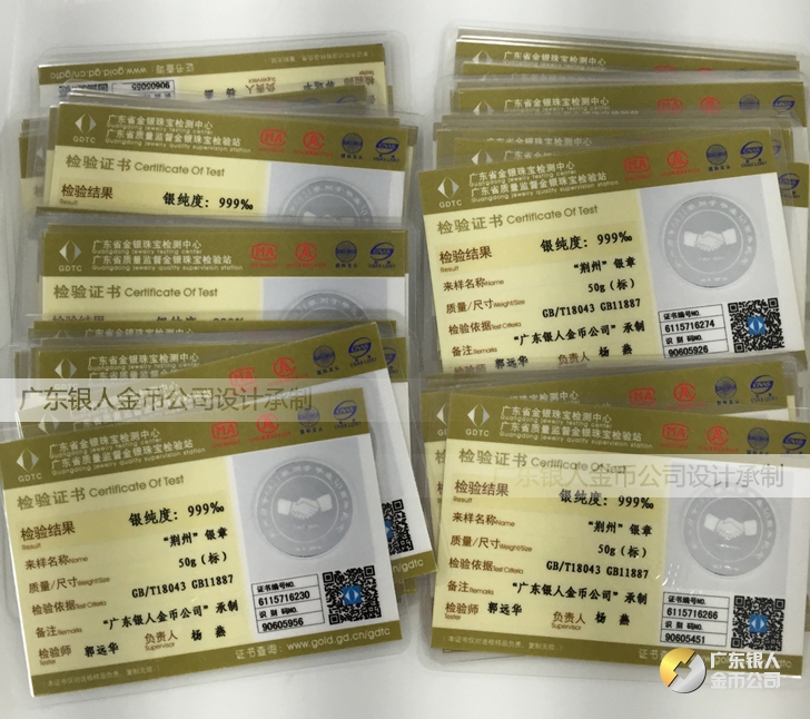 廣東銀人金幣公司承接客戶個(gè)性化定制的金銀幣、金銀章、金銀條、金銀牌、金銀盤均由國家質(zhì)監(jiān)部門、嚴(yán)格檢測、權(quán)威鑒定: