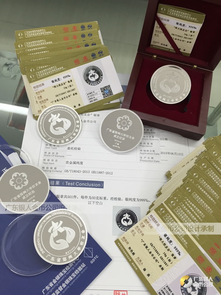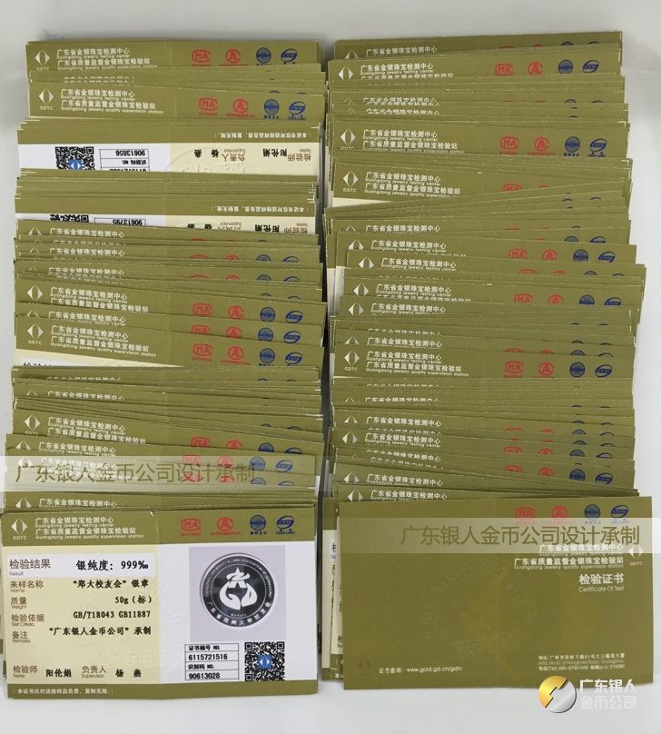 廣東銀人金幣公司承接客戶個性化定制的金銀幣、金銀章、金銀條、金銀牌、金銀盤均由國家質(zhì)監(jiān)部門、嚴(yán)格檢測、權(quán)威鑒定: 出具————國家質(zhì)檢、檢測報告。
