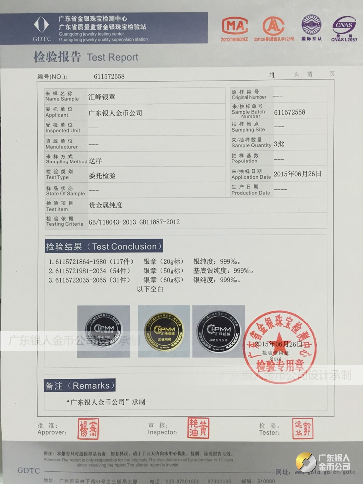 廣東銀人金幣公司承接客戶個性化定制的金銀幣、金銀章、金銀條、金銀牌、金銀盤均由國家質監部門、嚴格檢測、權威鑒定: