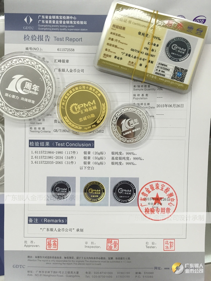 廣東銀人金幣公司承接客戶個性化定制的金銀幣、金銀章、金銀條、金銀牌、金銀盤均由國家質監部門、嚴格檢測、權威鑒定: