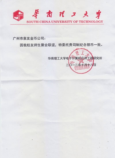 2012年10月華南理工大學校友會師生聚會留念紀念幣定做