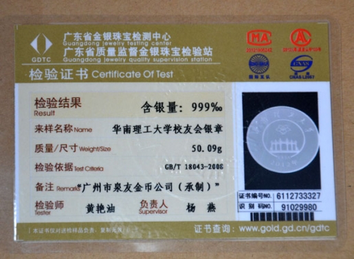 (華南理工大學校友會同學聚會師生留念紀念銀章定做檢測證書)