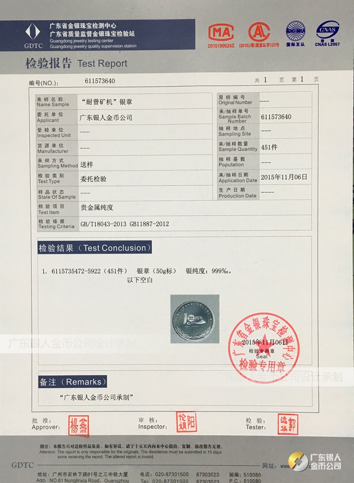 廣東銀人金幣公司承接客戶個性化定制的金銀幣、金銀章、金銀條、金銀牌、金銀盤均由國家質監部門、嚴格檢測、權威鑒定: