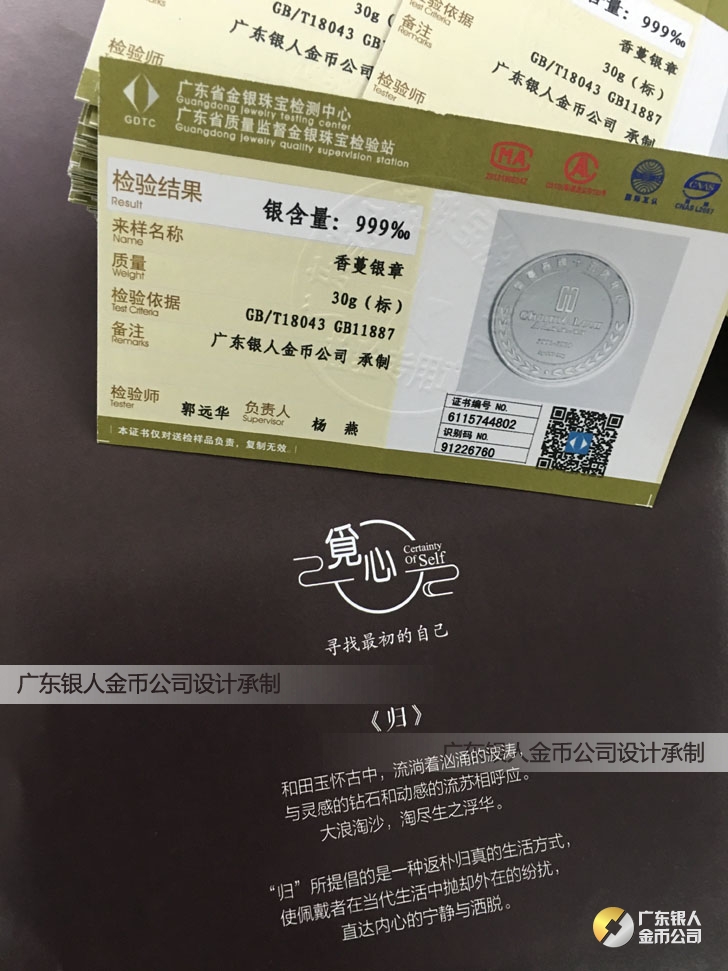 廣東銀人金幣公司承接客戶個性化定制的金銀幣、金銀章、金銀條、金銀牌、金銀盤均由國家質監部門、嚴格檢測、權威鑒定: