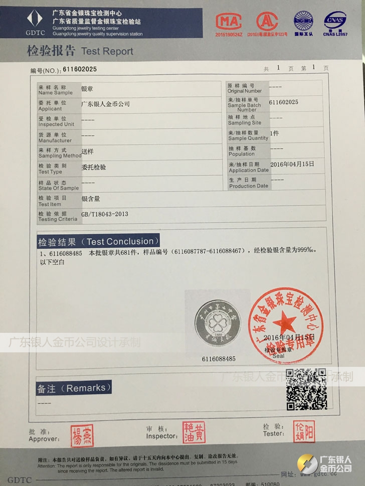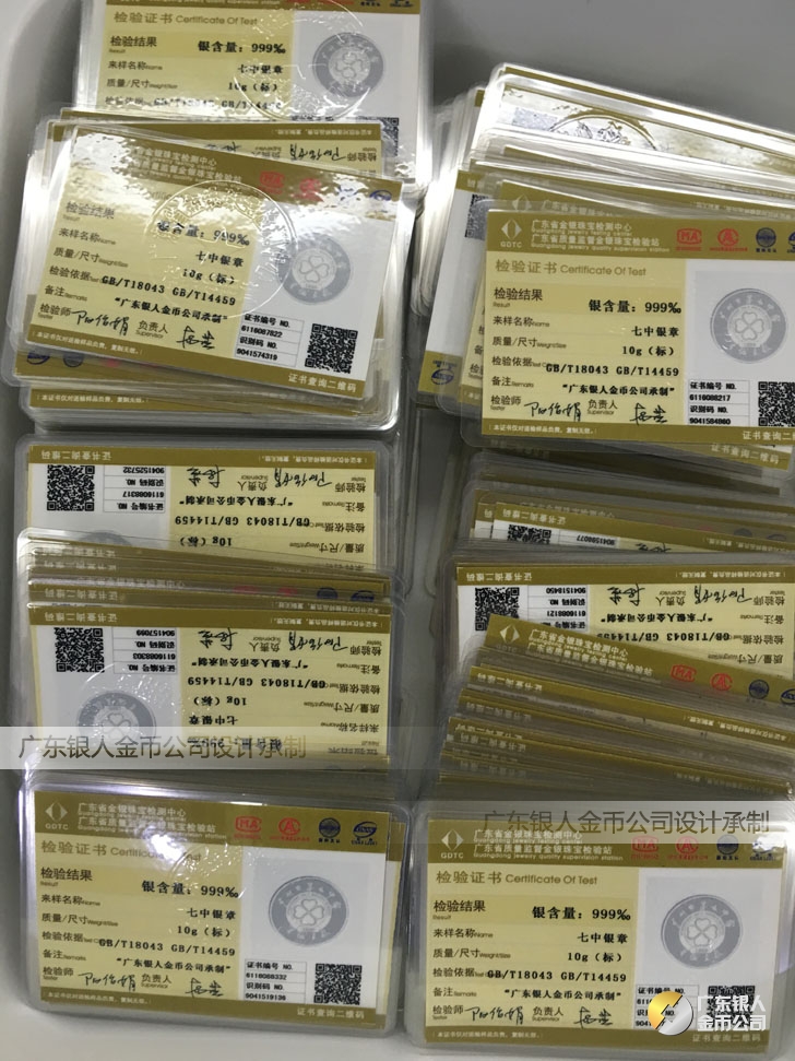 廣東銀人金幣公司承接客戶個性化定制的金銀幣、金銀章、金銀條、金銀牌、金銀盤均由國家質(zhì)監(jiān)部門、嚴(yán)格檢測、權(quán)威鑒定: