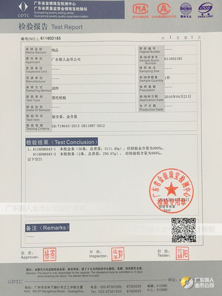 廣東銀人金幣公司承接客戶個性化定制的金銀幣、金銀章、金銀條、金銀牌、金銀盤均由國家質監部門、嚴格檢測、權威鑒定: