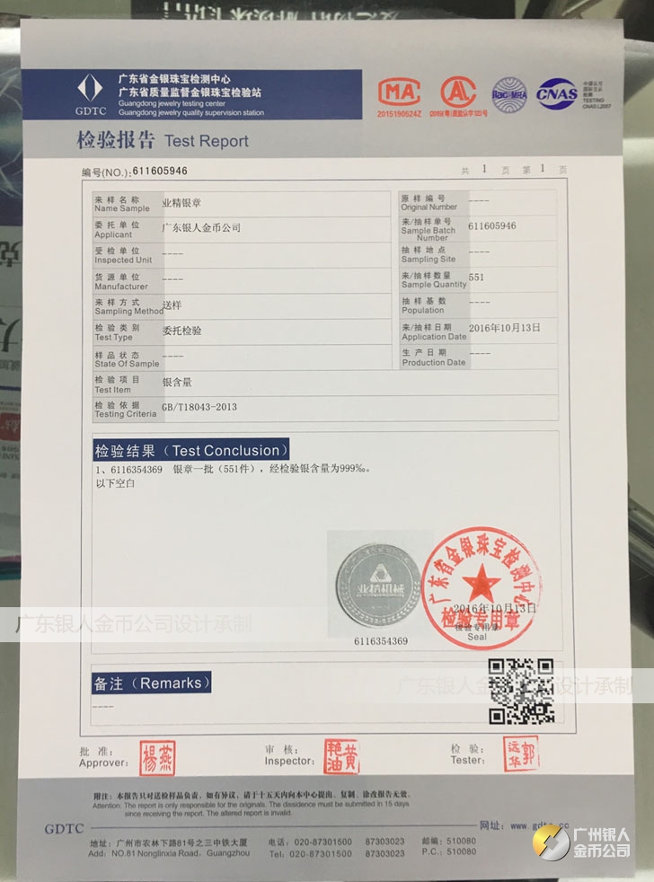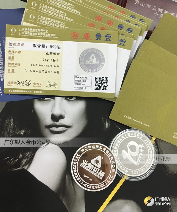 廣東銀人金幣公司承接客戶個性化定制的金銀幣、金銀章、金銀條、金銀牌、金銀盤均由國家質監(jiān)部門、嚴格檢測、權威鑒定: