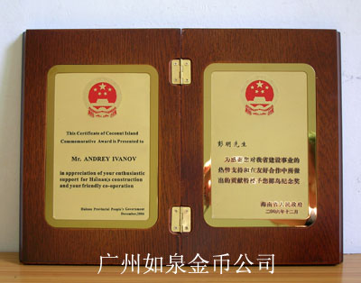 海南省人民政府--表彰突出貢獻的國內外經濟學專家“椰島友誼獎”證書獎牌制和“椰島紀念獎”獎牌制作,均為高檔實木獎牌制作。