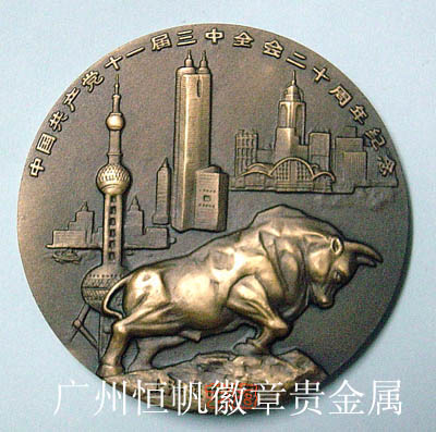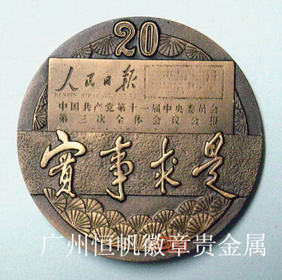 紀念章為銅質(古銅色),圓形,直徑60毫米.正圖為《人民日報》發表十一屆三中全會公報的題頭及鄧小平題寫的“實事求是”手跡。周圍飾以松枝,上部“20”表示二十周年.背田主景為拓荒牛,寓意在改革開放的道路上,以老黃牛的精神去開拓進取,背量為深圳、上海.香港的標志性建筑.上緣鐫刻主題文字“中國共產黨十一屆三中全會二十周年紀念”。