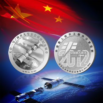 正面鐫刻有“天宮一號/神舟九號交會對接紀念銀章”字樣,以神舟九號飛船與天宮一號成功對接為主畫面,背景為地球和飄揚的五星紅旗;背面鐫刻“中國載人航天工程辦公室監制”和“國家標準純銀紀念徽章”字樣,“中國載人航天”標識躍然云紋設計“2012”之上,表示2012年實現了中國載人航天又一壯舉。