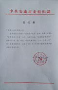中共安康市委組織部優秀黨務工作者獎章定制公函