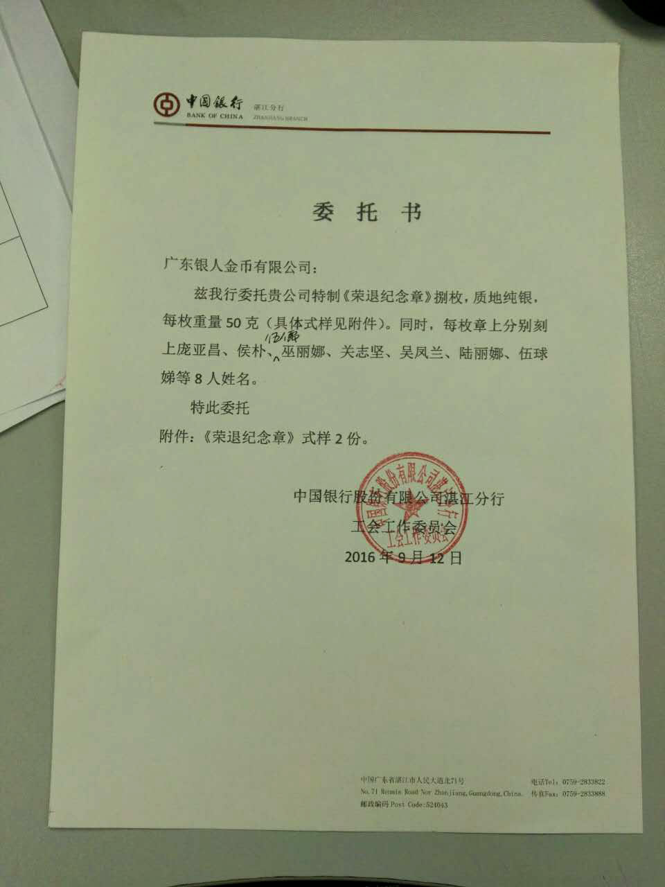 中國銀行湛江分行委托定制銀幣行文紅頭文件公函