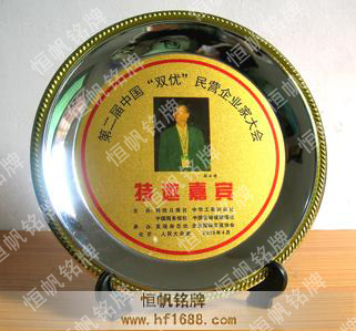 高檔獎碟獎盤獎品,外面為金屬圓盤(有各種規格型號的大小獎盤),中間為PVC印刷圖案,下方有精致底架(可分為金屬與塑料),高檔。也可根據客戶需求來樣加工定制。