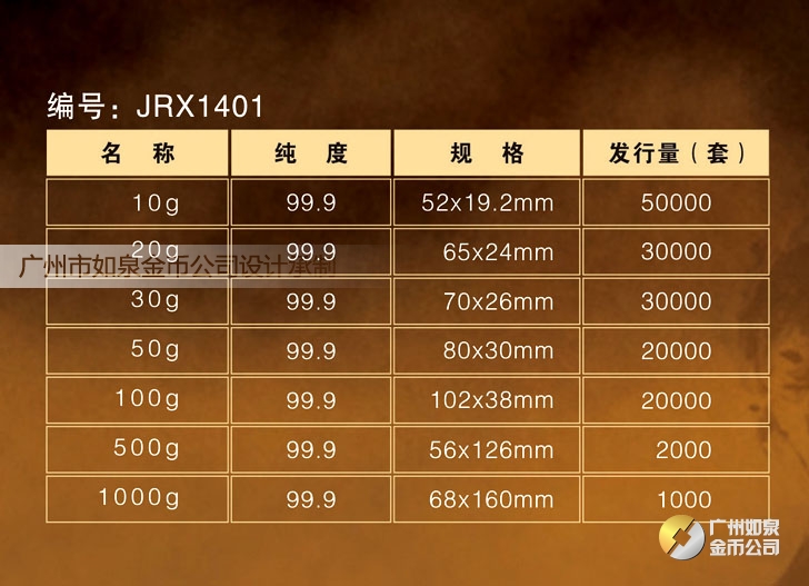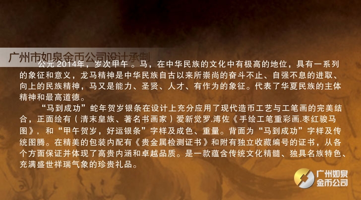 廣州市如泉金幣公司依托上海造幣廠和深圳國寶造幣廠等造幣公司以及金銀制品廠,設(shè)計定做紀(jì)念幣、紀(jì)念章、金銀幣、金銀章、金銀條,采用造幣工藝、選用千足金銀,個性定制金幣、定做銀幣、訂做金條、訂制銀條、制作紀(jì)念銀幣、制造紀(jì)念金幣、加工紀(jì)念銀章、生產(chǎn)紀(jì)念金章,純金純銀鑄造、全部國檢、權(quán)威檢測。